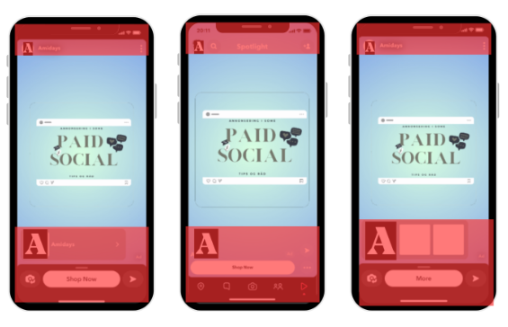Snapchat: For betalt annonsering anbefales det å bruke 9:16 format (fullskjerm) for alle typer annonser og organisk. Når det gjelder safezones er de relativt like uansett hvilken type annonsering du bruker (Story, Spotlight og Collection). Plasser all viktig informasjon utenfor de røde områdene.