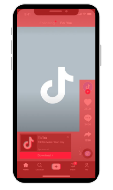 TikTok: TikTok har det minste området tilgjengelig. For betalt annonsering anbefales det å bruke 9:16 format (fullskjerm) for alle typer annonser. Plasser all viktig informasjon utenfor de røde områdene.